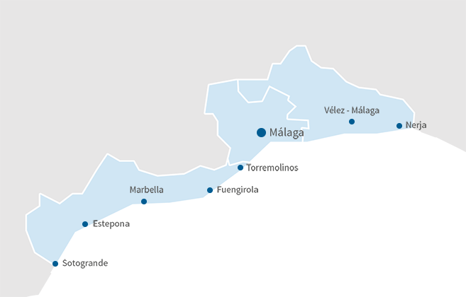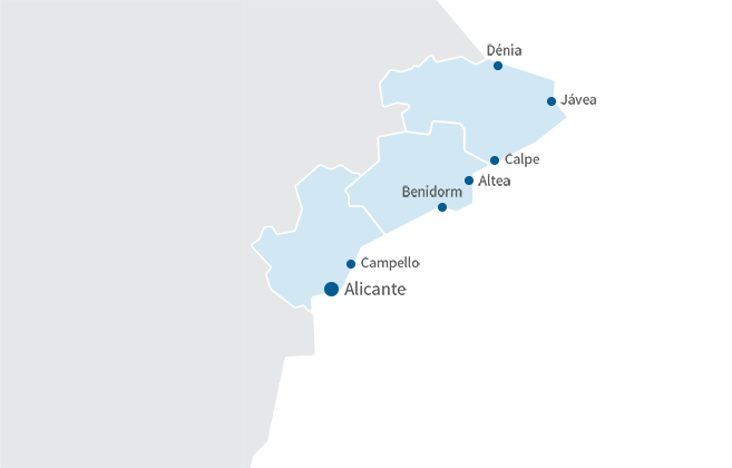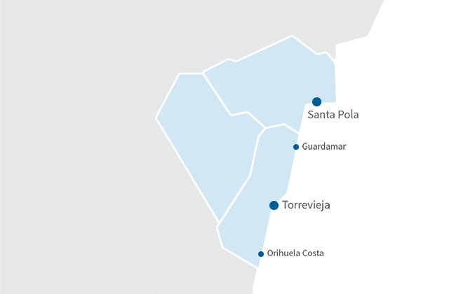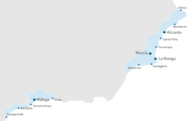 Fra Dénia til Mazarrón gennem så populære steder som Benidorm, Altea, Guardamar, Ciudad Quesada, Torrevieja, Orihuela Costa, Los Alcázares og La Manga del Mar Menor, Málaga, Fuengirola, Estepona, Marbella and Sotogrande. Det kan være med havudsigt, lige ud til en golfbane, i nærheden af faciliteter, etc. Alle steder tilbyder vi boliger, der kan tilpasses køberens behov.